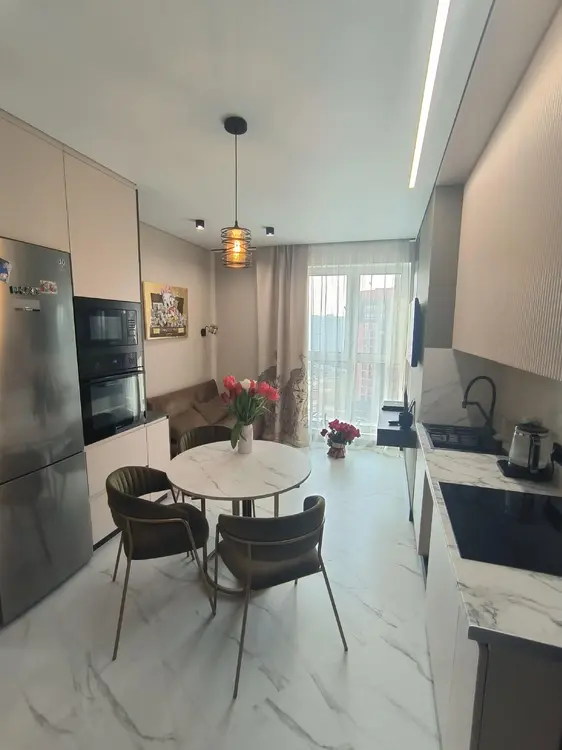 Квартира полностью мебелирована и оборудована современной техникой. Установлены двери скрытого монтажа, встроенная кухня – крашенный МДФ, совмещенный санузел облицован дорогой испанской плиткой.