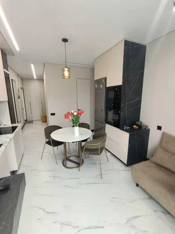 В квартире площадью 45,9 м.кв. (по СНБ) выполнен современный дизайнерский ремонт, где использован каждый сантиметр пространства. Таким образом мы получили две изолированные комнаты с большими панорамными окнами и кухню-гостиную.