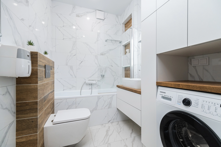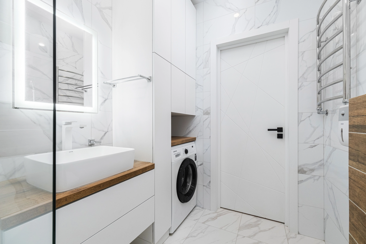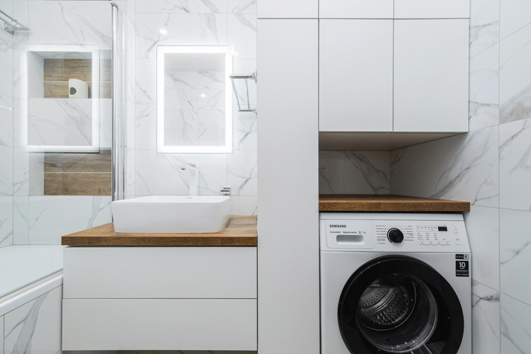 - Есть проточный водонагреватель, стиральная машина, удобная накладная раковина, зеркало с подсветкой, подвесной унитаз. Установлен нажимной ревизионный люк скрытого монтажа под плитку.
