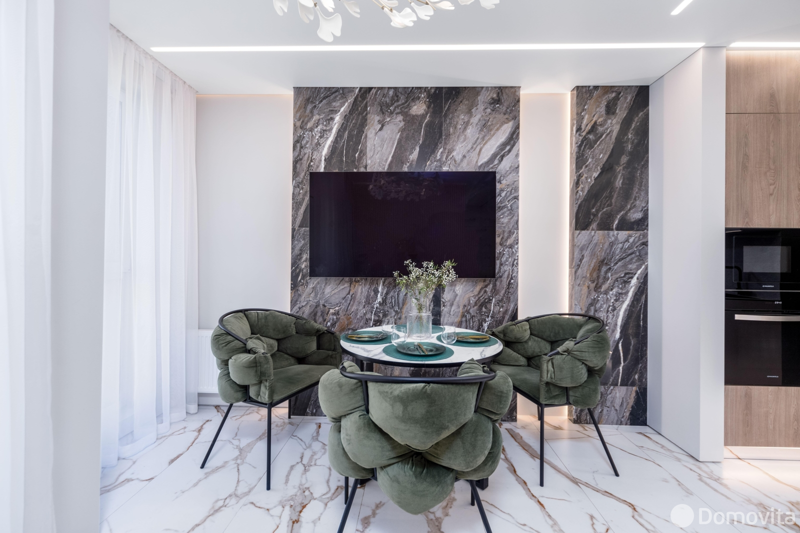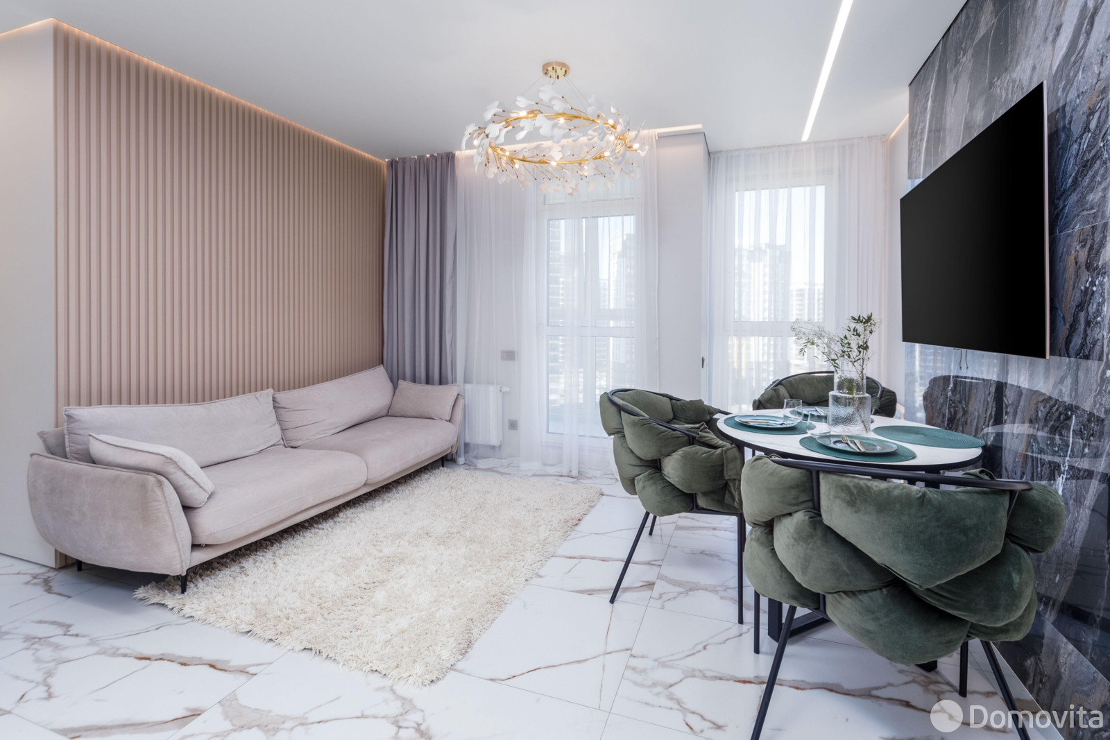 На полу и стенах итальянский керамогранит, подогрев пола, акцентная стена за диваном – объёмные гипсовые панели, изысканная обеденная группа с удобными стульями, телевизор LGOLEDдиагональ65 дюймов, система кондиционирования (на фото кондиционер не показан, коммуникации выведены, монтаж блока в ближайшее время).
