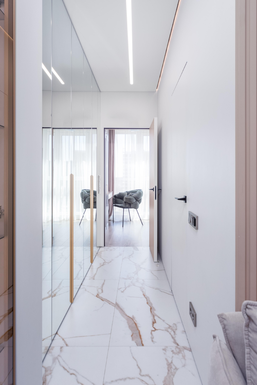 - Прихожая: шкаф для верхней одежды и хранения обуви, зеркало от пола до потолка с подсветкой, подогрев пола, видеодомофон.