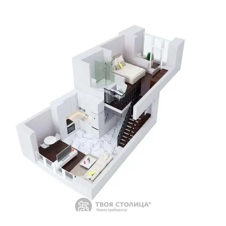 Квартира с возможностью разделения на комнаты по индивидуальному проекту будущего собственника. Уникальный формат жилья - антресольный этаж, двойной свет