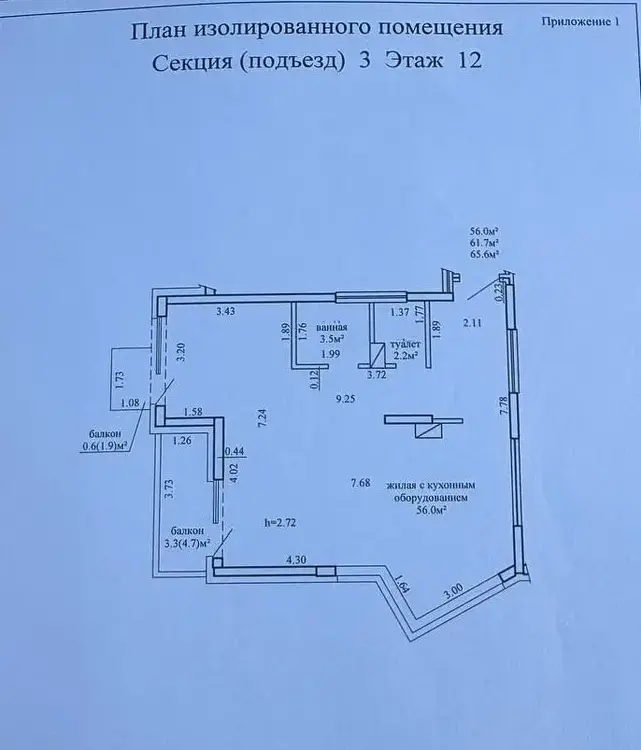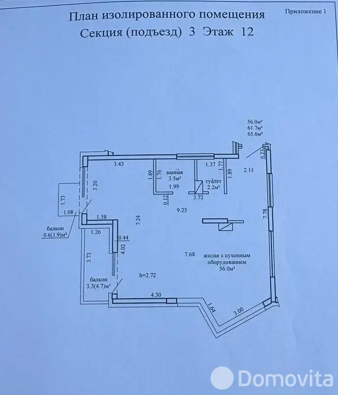 Площадь по СНБ — 65,6 м. Свободная планировка позволяет реализовать полноценную 3-комнатную квартиру или евротрёшку с кухней-гостиной и двумя отдельными спальнями.