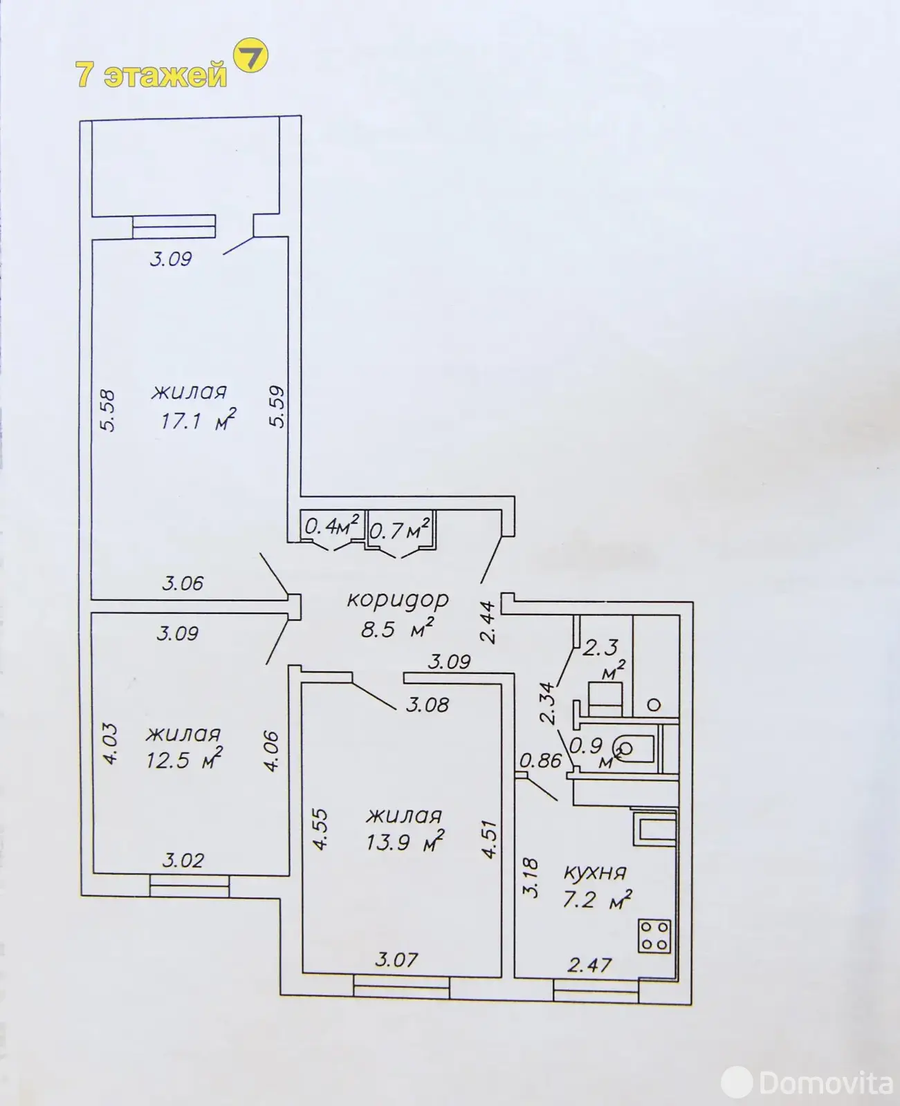 -Площадь по СНБ - 65,6 м2, общая - 63,5 м2, жилая - 43,5 м2, кухня - 7,2 м2,
