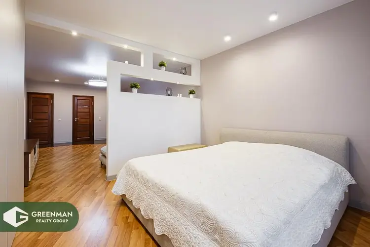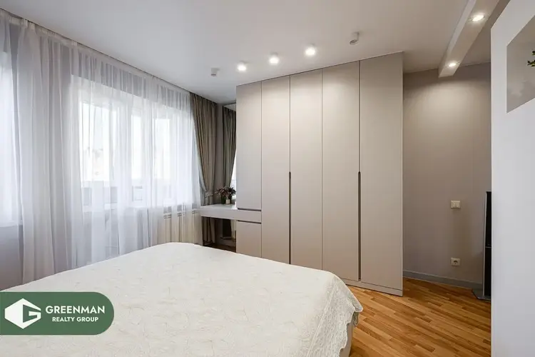 Две вместительные гардеробные комнаты; раздельный санузел, облицованный плиткой современного образца; просторная кухня 13 м2, полностью оборудована бытовой техникой импортного производства.