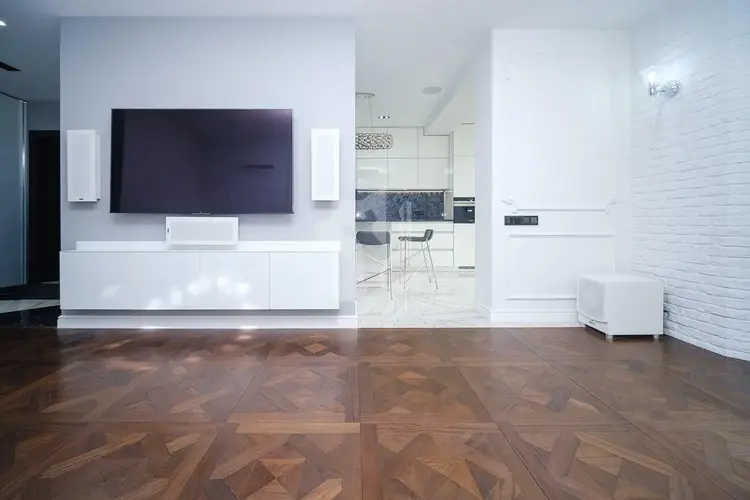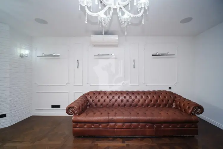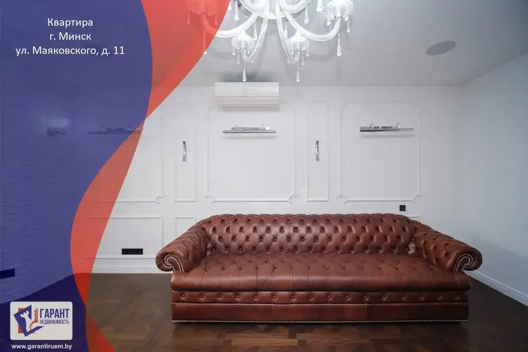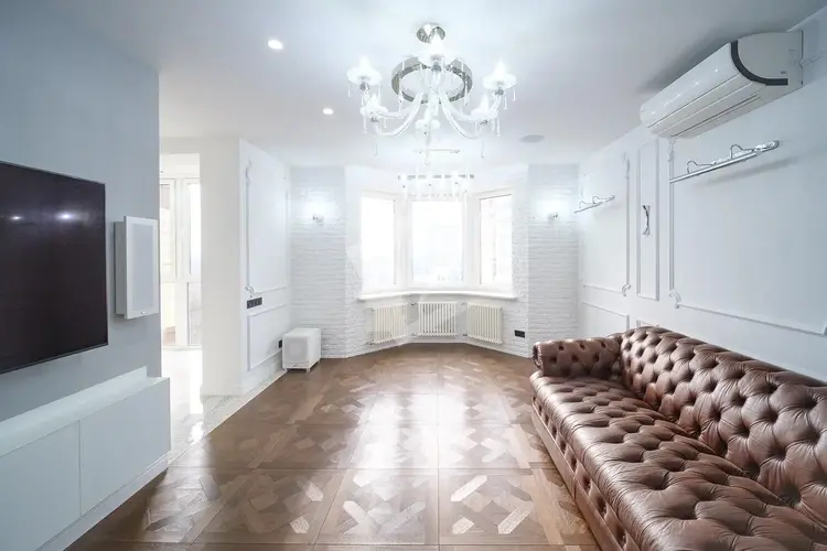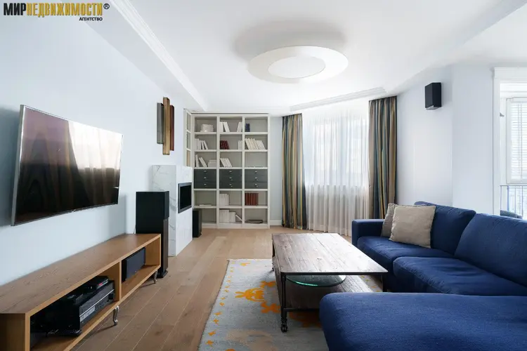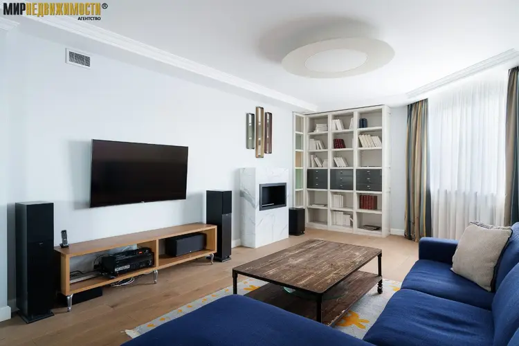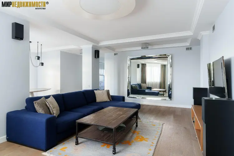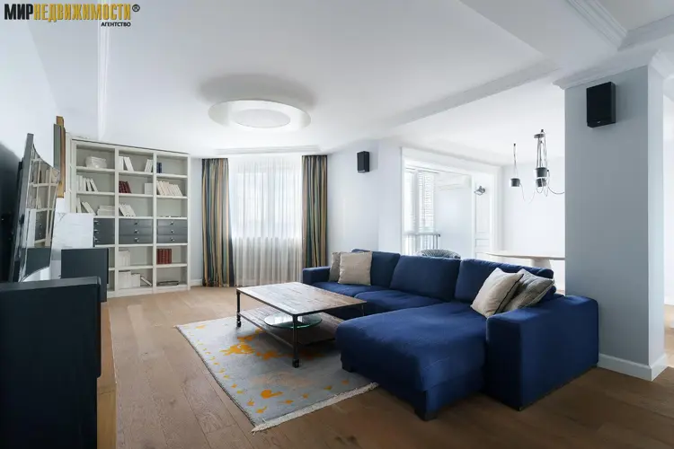 · Большая гостиная с кожаным диваном честер, вся в африканском паркете, с кинозоной – телевизор Сони 65’ и система объемного звучания 5.1. Ничего лишнего, много света и воздуха, разные варианты света от холодного до теплого. Можно добавить мебели по вкусу.