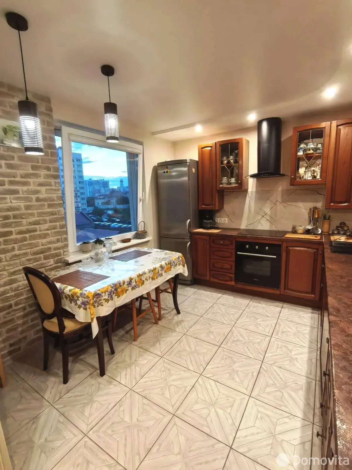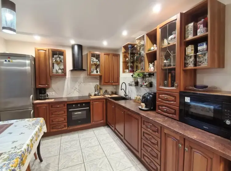 Кухня оборудована встроенной индукционной варочной поверхностью, духовым шкафом, посудомоечной машиной, вытяжкой. Установлен фильтр воды.
