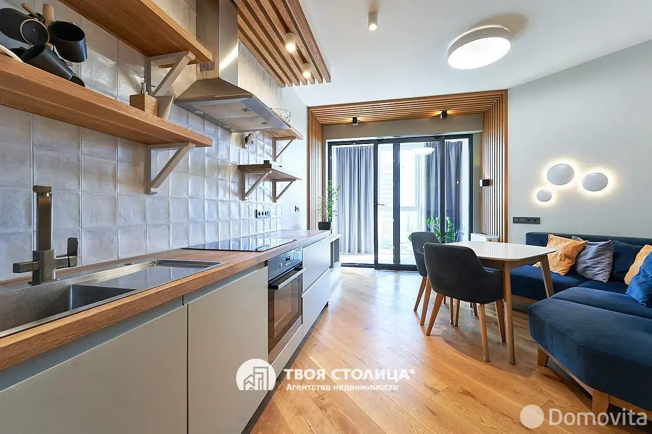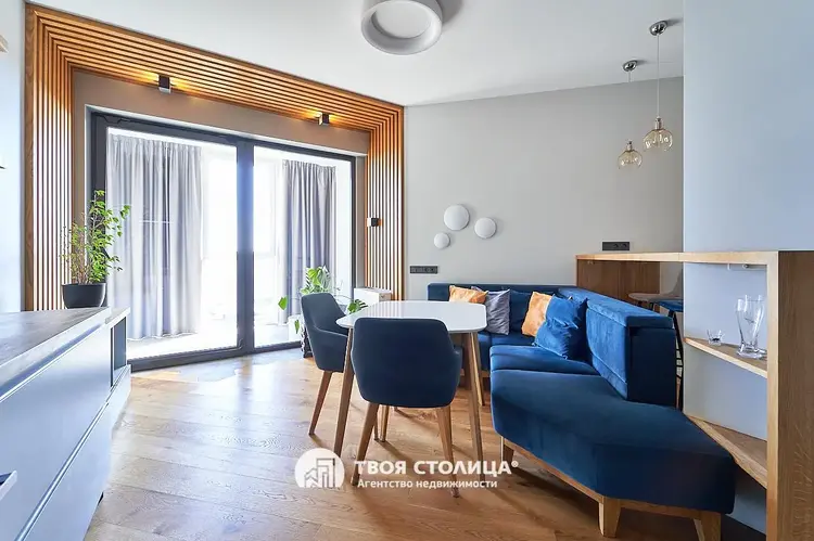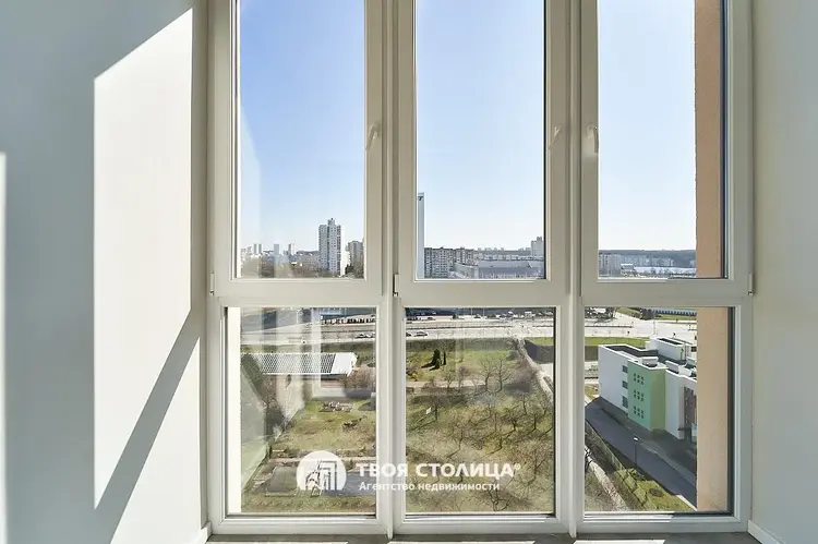Свет: три окна на южную сторону, вид на библиотеку и Белтелерадиокомпанию. В интерьере — сценарии освещения от функционального до мягкого отражённого.