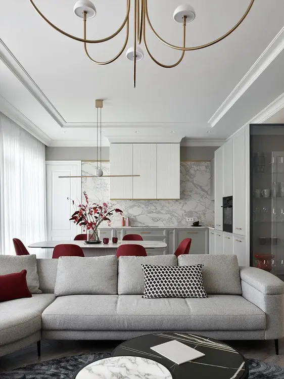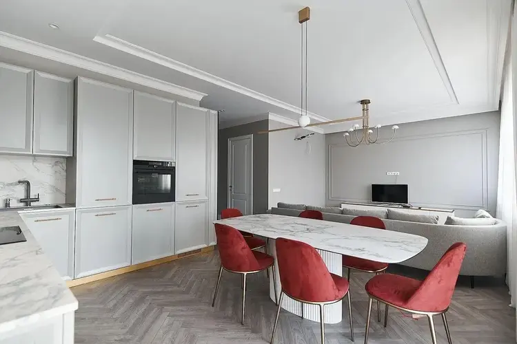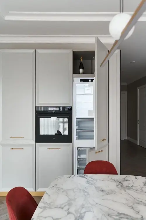Диван, кровать, стулья, пуф - фабричные, заказывали из Италии. Техника в кухне бренда AEG (варочная панель, духовой шкаф, посудомоечная машинка) холодильник Liebherr) , установлен измельчитель пищевых отходов.