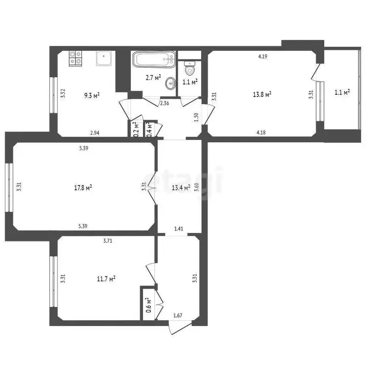 · Три раздельные комнаты (17.8, 13.8,11.7) м.кв.