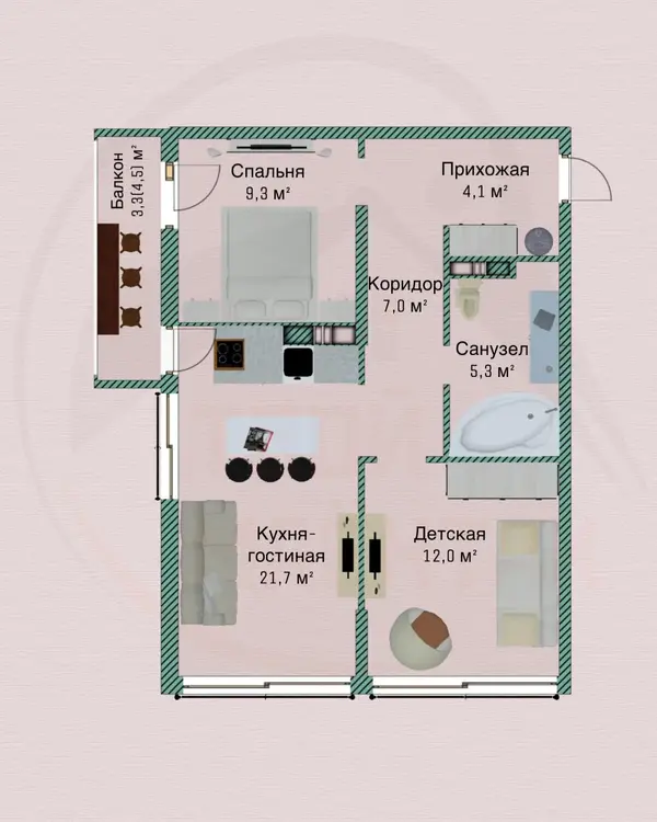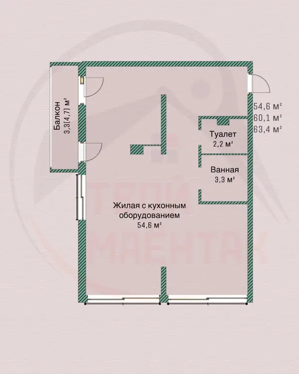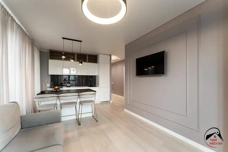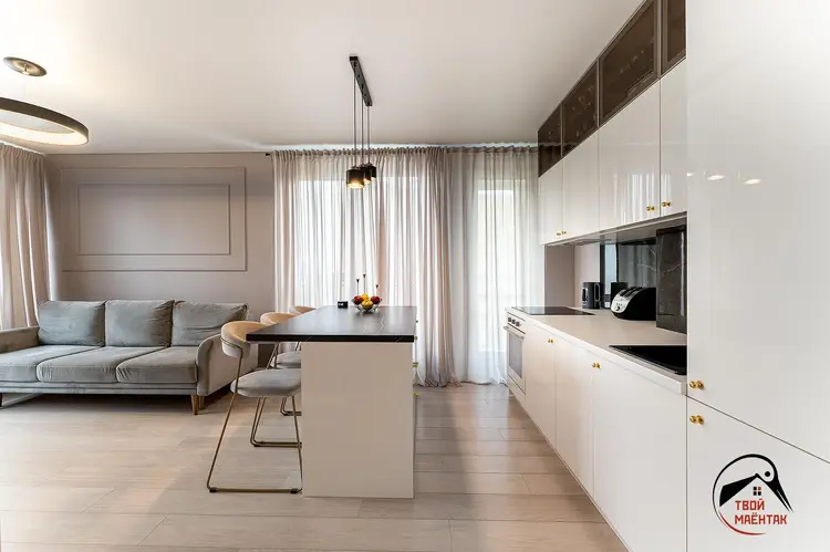 Квартира невероятно светлая и уютная, с большими окнами в пол. Стены под покраску. На полу