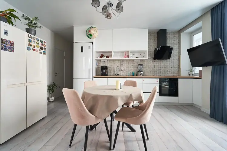 Кухня-гостиная: визитная карточка нашей квартиры, для сбора всей семьи и гостей. Полноценная обеденная зона и кухонная мебель с качественной фурнитурой и материалами.