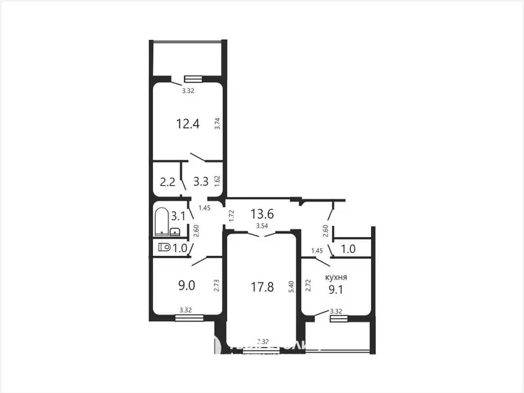Две застеклённые лоджии: одна из кухни, другая из комнаты. На полу лоджий и кухни — плитка, в комнатах — паркет.