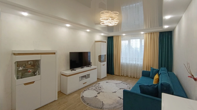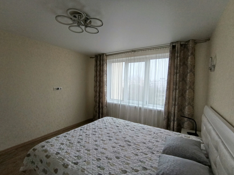 Отличный современный ремонт. Металлическая входная дверь, межкомнатные двери МДФ, натяжные потолки, шкаф-купе, встроенная кухня, стеклопакеты ПВХ застеклены окна в квартире и две лоджии.