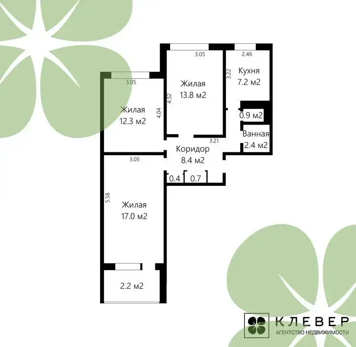 Три раздельные комнаты (13.8м2, 12.3м2 и 17,0м2) прямоугольной формы предоставляют широкие возможности для зонирования и меблировки. Окна выходят на обе стороны, обеспечивая прекрасное естественное освещение и циркуляцию воздуха. Раздельный санузел – дополнительный комфорт для всей семьи.