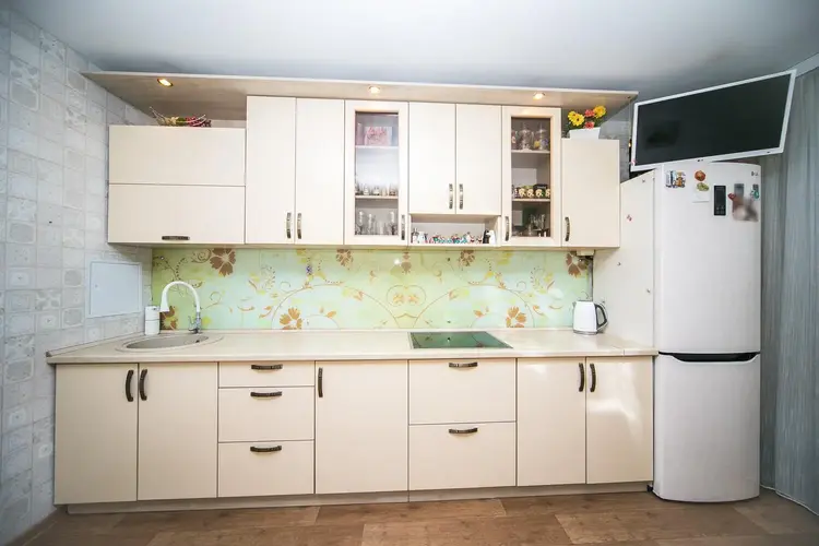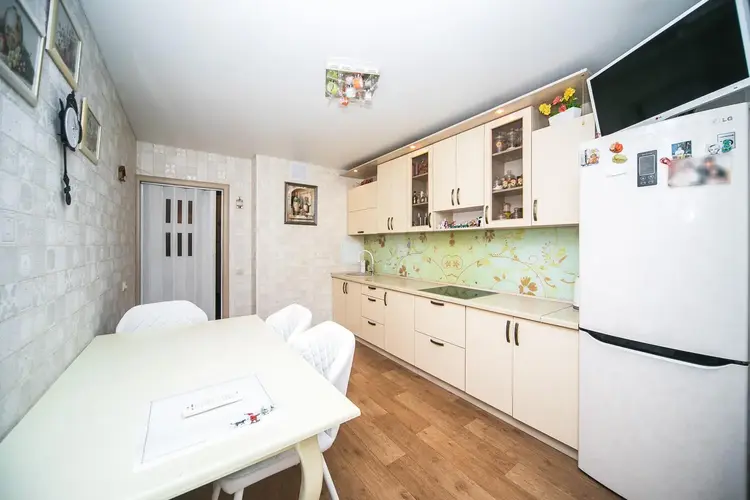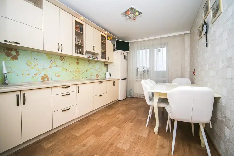 Общая площадь по СНБ 77, 2 кв.м., общая площадь 74,6 кв.м., жилая площадь 41, 6 кв.м., площадь кухни 12, 4 кв.м. С кухни организован выход на застекленную лоджию, что максимально удобно для организации домашнего быта. Высота потолков 2, 52 метра.