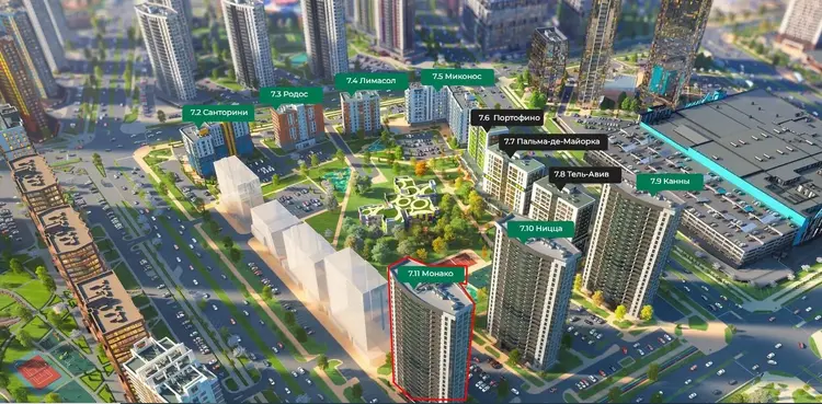 Зеленая парковая зона, международный финансовый центр и крупнейший торговый центр Авиа Молл в центре комплекса.