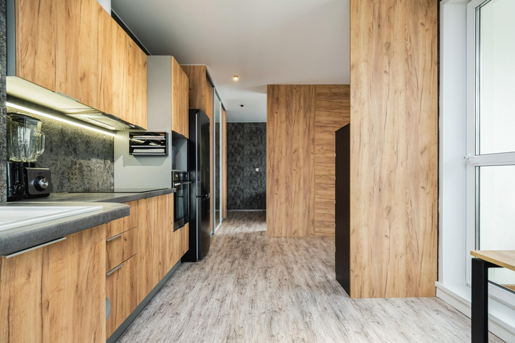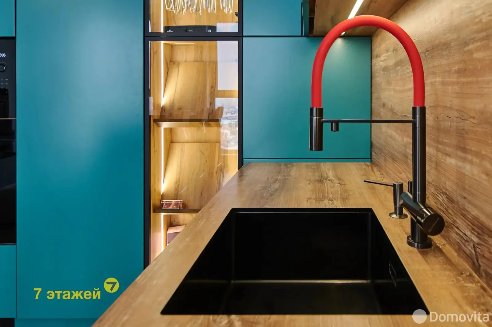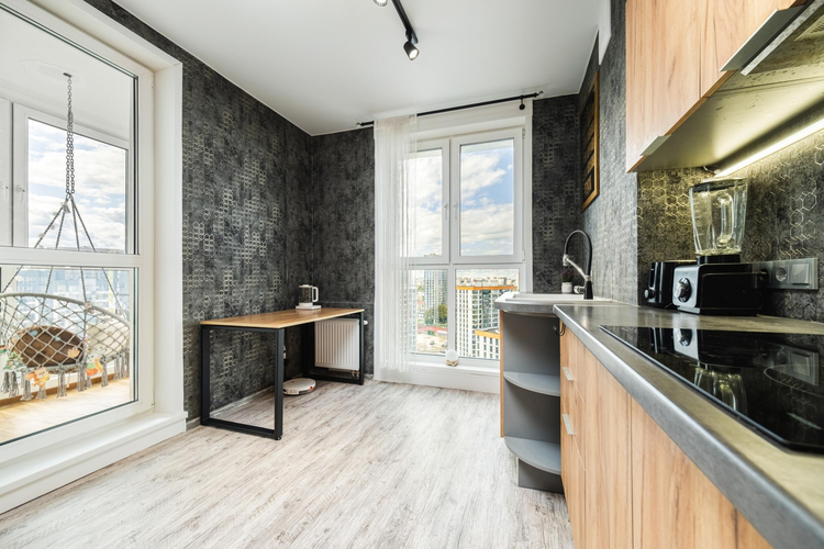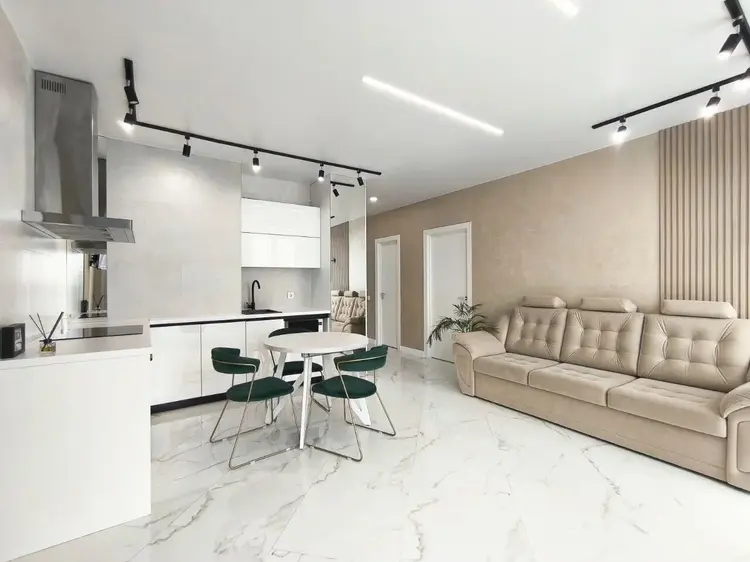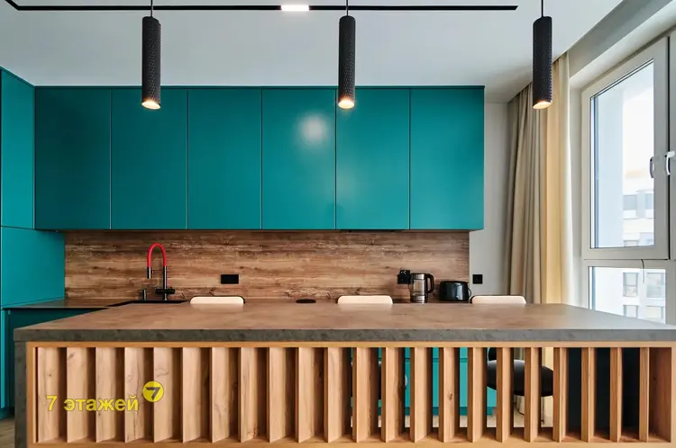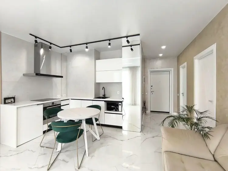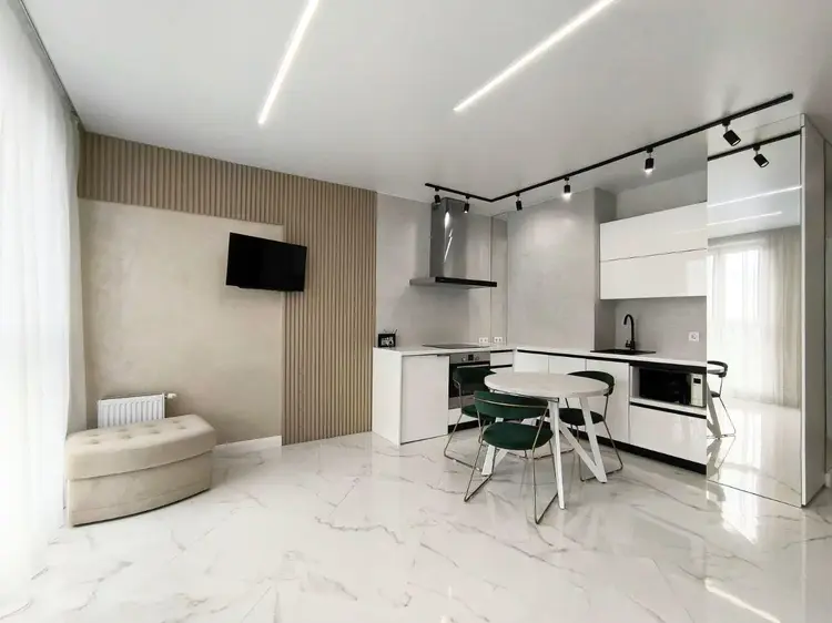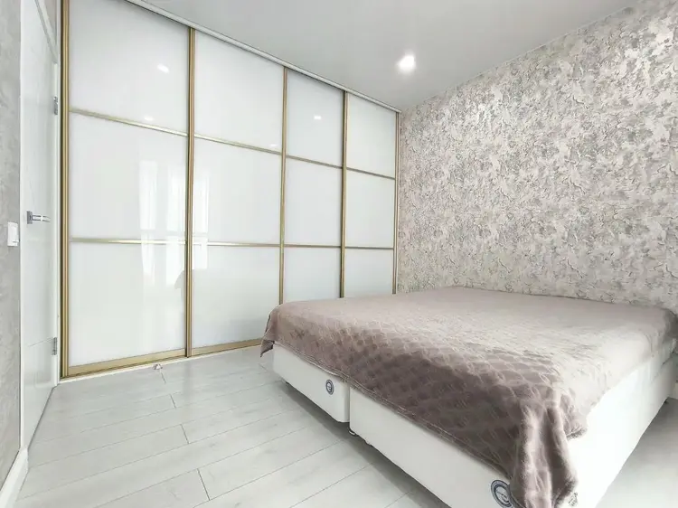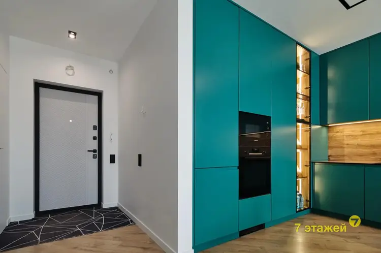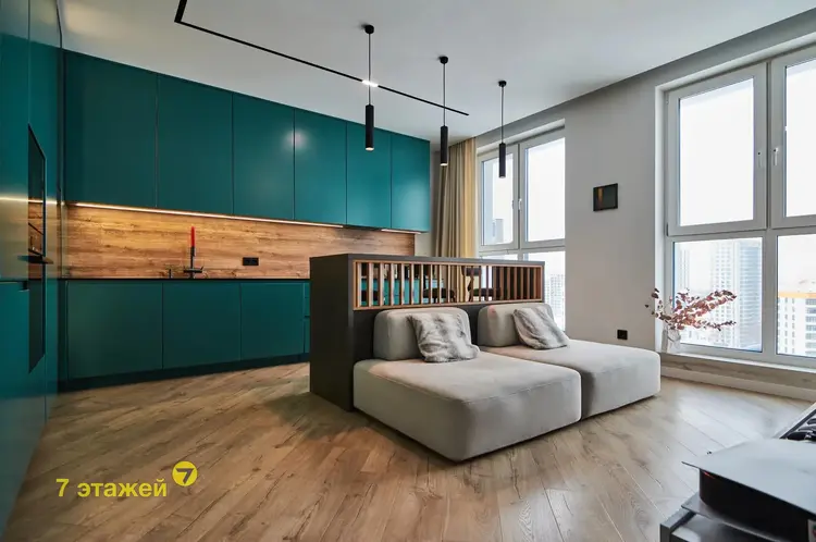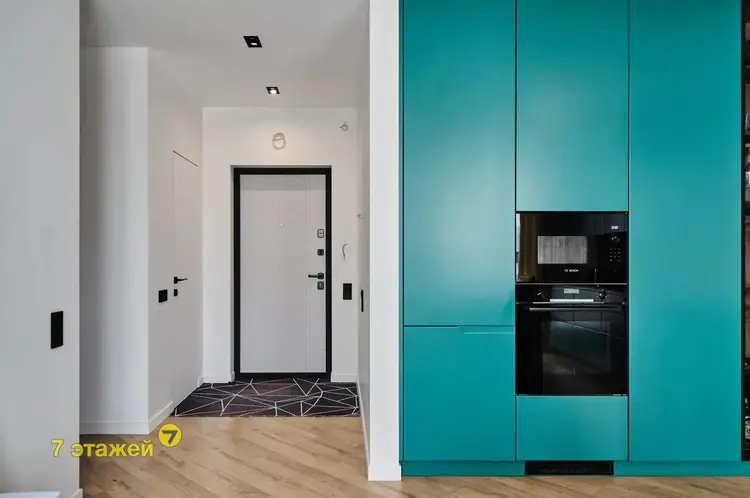 На просторной кухне площадью 21.2 кв. м. установлена современная и высококачественная техника известных мировых брендов, в том числе варочная поверхность, посудомойка, духовой шкаф, холодильник. Во всех помещениях детально продуманы оригинальные световые дизайн решения. Две раздельные жилые комнаты площадью 8.1 кв. м. и 13.75 кв. м. соответственно. Дизайн проектом предусмотрена гардеробная площадью 2 кв. м.