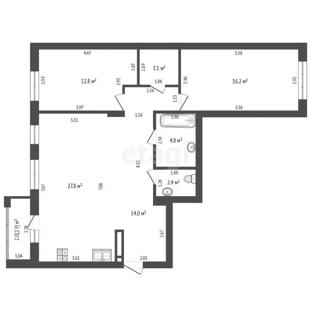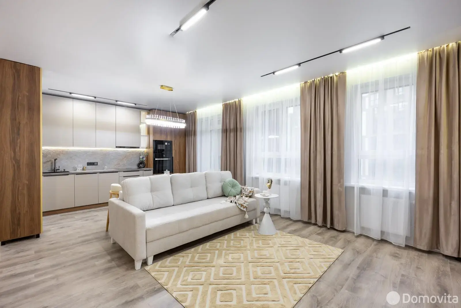 Планировка продумана до мелочей: просторная кухня-гостиная, две отдельные спальни на разные стороны, раздельный санузел, гардеробная, застеклённая лоджия. Высокие потолки и большие окна делают квартиру светлой и уютной.