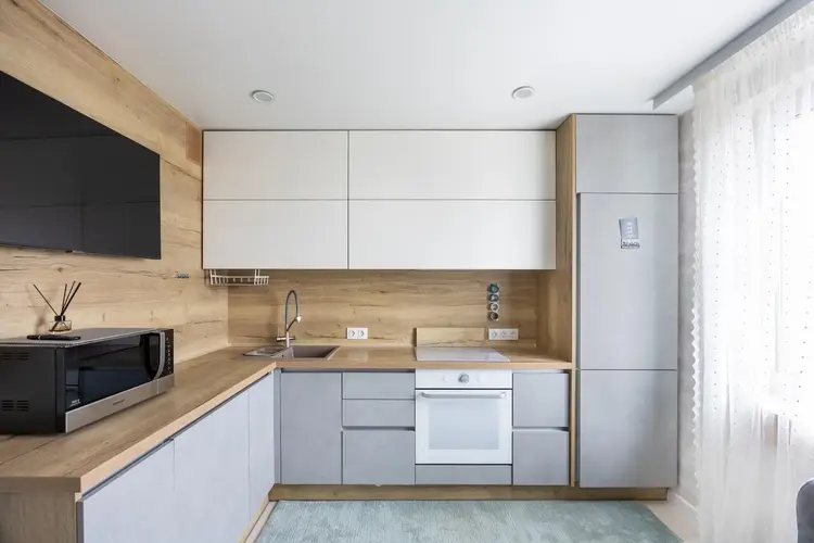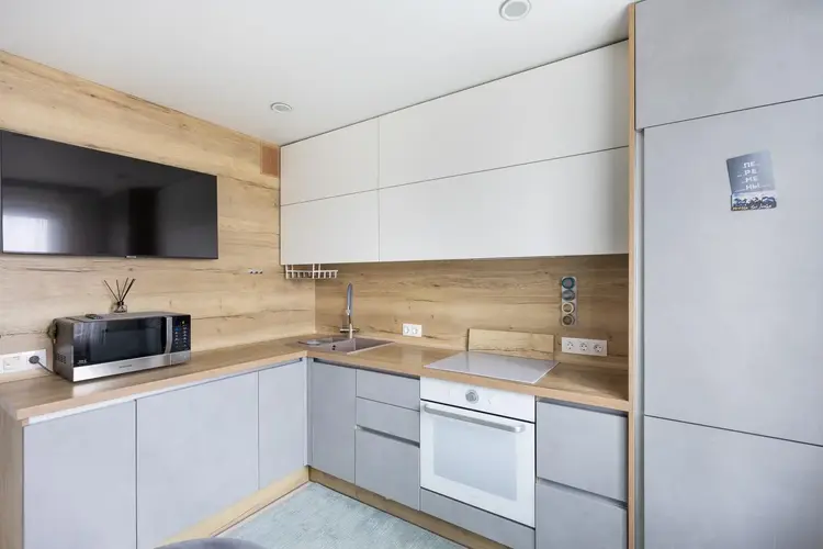 Кухня 9,5 м2 оборудована всей необходимой техникой: посудомоечная машина, встроенный холодильник, вытяжка, электрическая варочная панель и духовой шкаф. Установлен теплый пол.