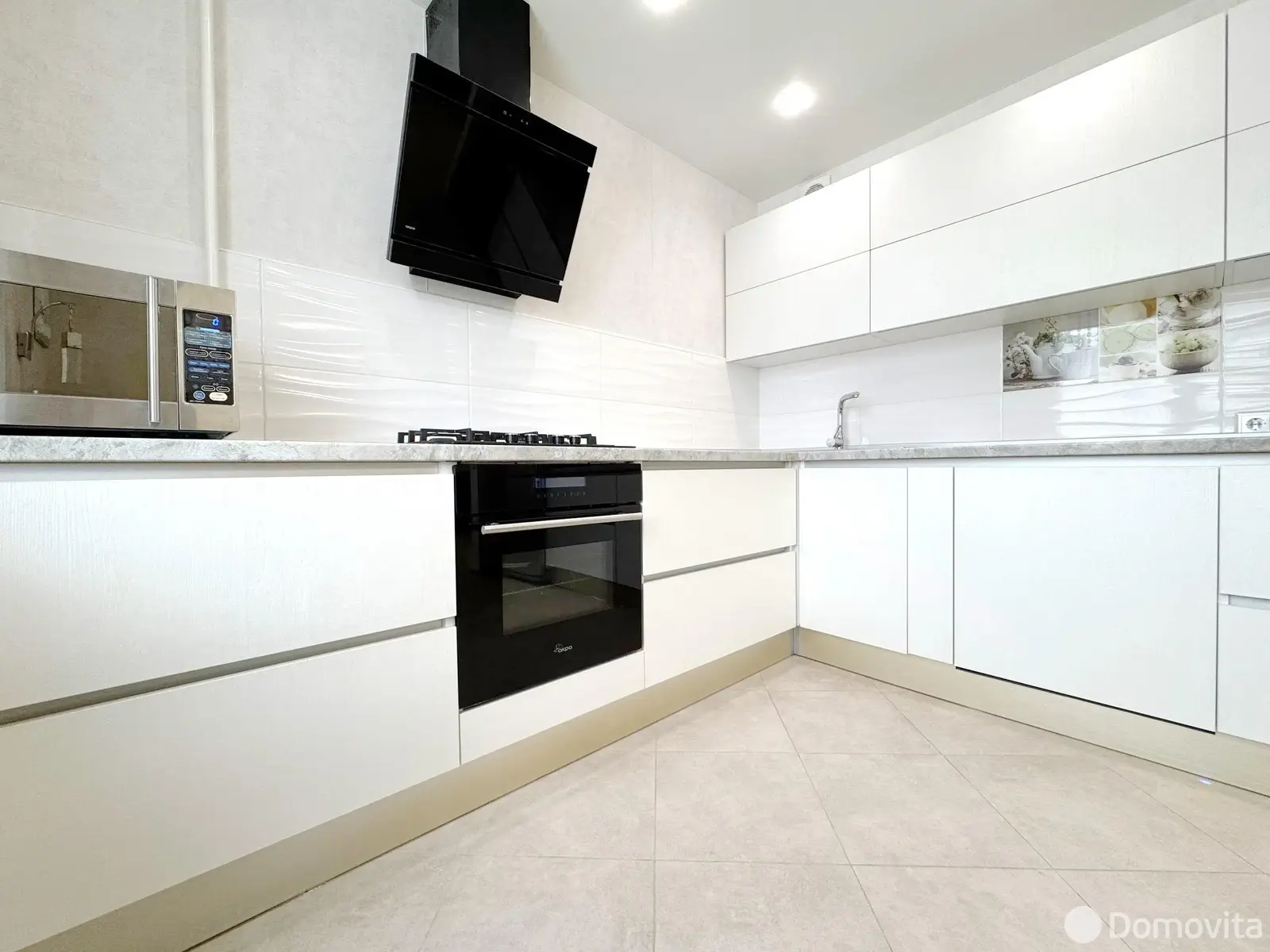 Кухня укомплектована всей необходимой бытовой техникой: духовой шкаф и вытяжка Akpo, варочная панель Gefest, посудомоечная машина шириной 60см Siemens, шкафчики с фурнитурой Blum, смеситель с выдвижным краном Teka.