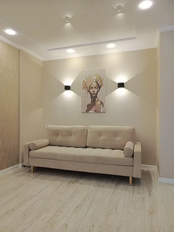 Зеркальный встроенный шкаф высотой 358 см. Заказные Кровать 200х180см и Диван Boco 330 см. Паркет дуб натуральный под маслом ( Испания), керамогранит Травертин широкоформатный 1200х1200 (Испания). Теневые плинтуса и теневые потолки из гипсокартона с встроенными светильниками и треками с встроенными мощными светильниками с демированием и управлением через приложение. Предусмотрены электро-механизмы для штор с управлением.