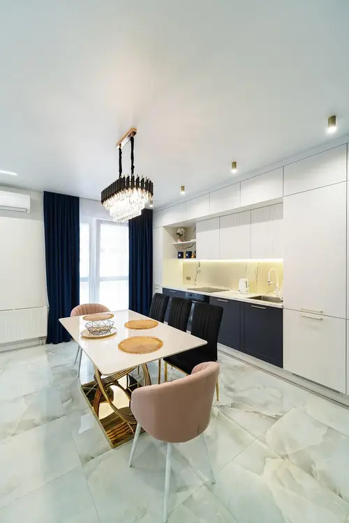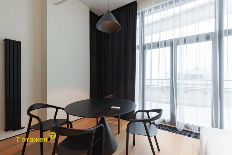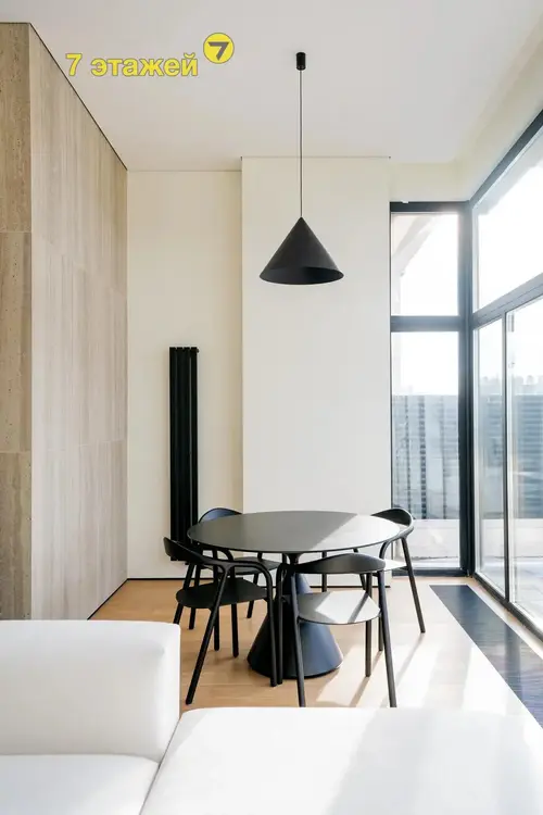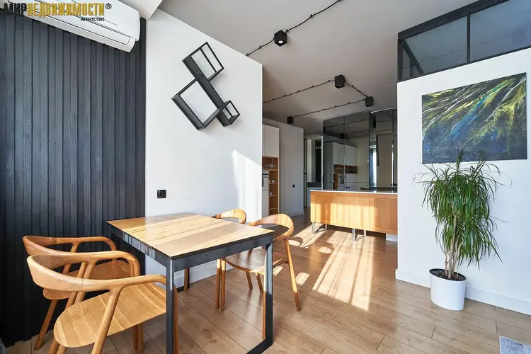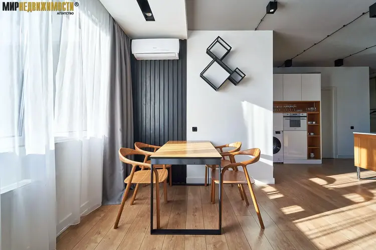 Обеденная зона: стол димаметр 120см натуральное дерево дуб и 4-х стульев из дуба. Предусмотрена система кондиционирования в каждой комнате. Собственная Терасаса 44 м.кв с лучшим панорамным видом на озеро и библиотеку.