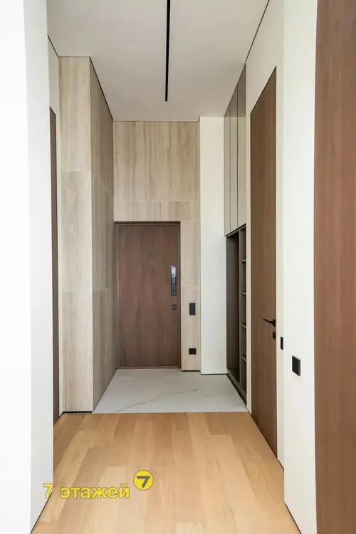 Входная дверь с внутренней панелью из шпона Американского ореха и умным замком СМАРТ. Межкомнатные двери скрытого монтажа из шпона Американского ореха высотой 300 см. Высота потолков 3.64 м. Встроенные внутрипольные конвектора Melenhoff. Новые окна черного профиля с фурнитурой ROTTO и выходом на террасу (44 кв). Стеновые панели и полка по ТВ 240 см из шпона Американского ореха.