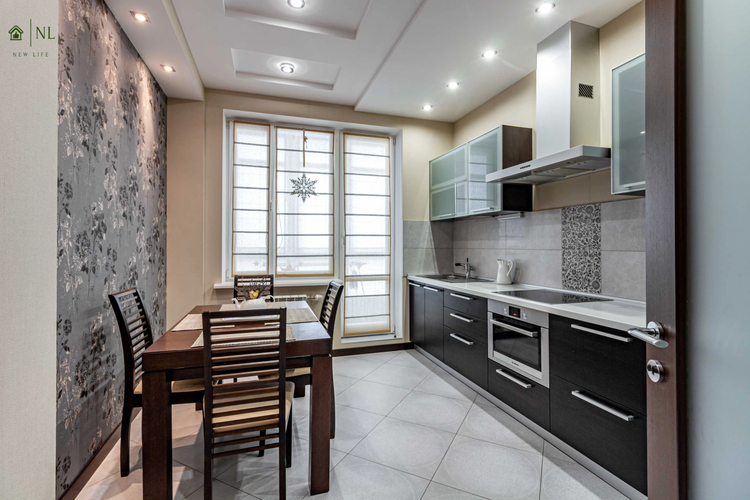 - Встроенная техника: варочная панель и посудомоечная машина AEG Electrolux, вытяжка Faber. Точечное освещение в разных зонах.