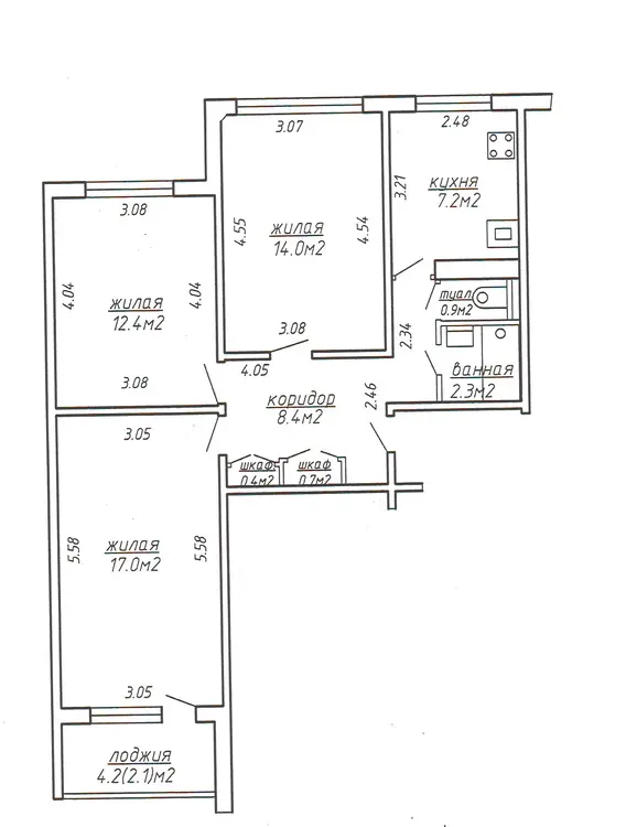 Квартира находится на 5 этаже 9-этажного панельного дома 1983 года постройки. Общая площадь составляет по СНБ 65.4 кв.м, общая площадь 63.3 кв.м., жилая – 43.4 кв.м, кухня – 7.2 кв.м. Изолированные комнаты, раздельный санузел и наличие лоджии.