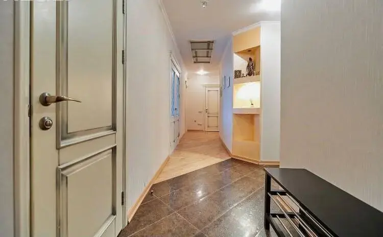В оконных проёмах стеклопакеты с профилем из ПВХ. Напольное покрытие: паркет, керамогранит. Комбинированные потолки с точечными и подвесными осветительными приборами. Межкомнатные двери - массив, входная металлическая.