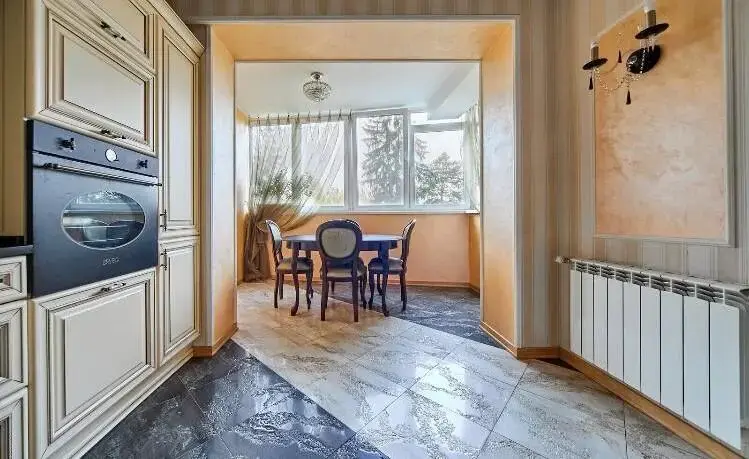 Выполнена дорогостоящая отделка с применением материалов, мебели и бытовой техники от ведущих профильных производителей. Встроенная кухонная мебель с фасадом из массива и техникой.