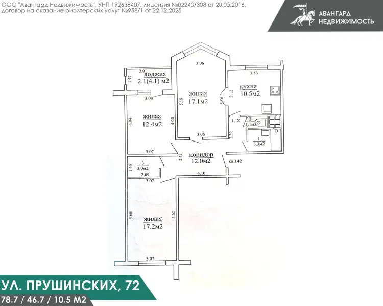 Современная планировка. Общая площадь 76.2(по СНБ 78.6) Жилая площадь 46.1 (две комнаты по 17кв. м.) Функциональная кухня 10.4 кв.м., где много места для всей семьи и гостей. Раздельный санузел, ремонт в санузле выполнен год назад. Есть кладовая комната. Планировка квартиры-соответствует техническому паспорту.