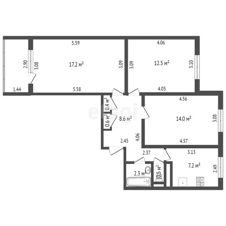 · 3 отдельные комнаты (12,5 м2, 17,2 м2, 14 м2) – идеально для семьи с детьми или для организации личного кабинета и гостевой зоны.
