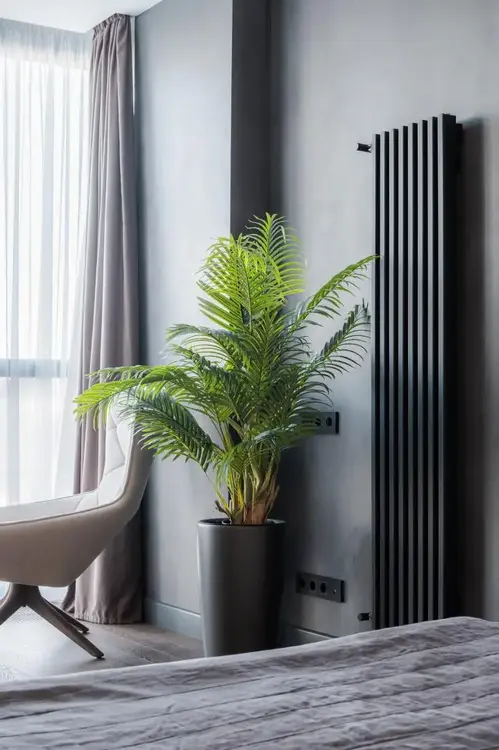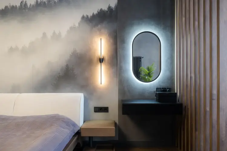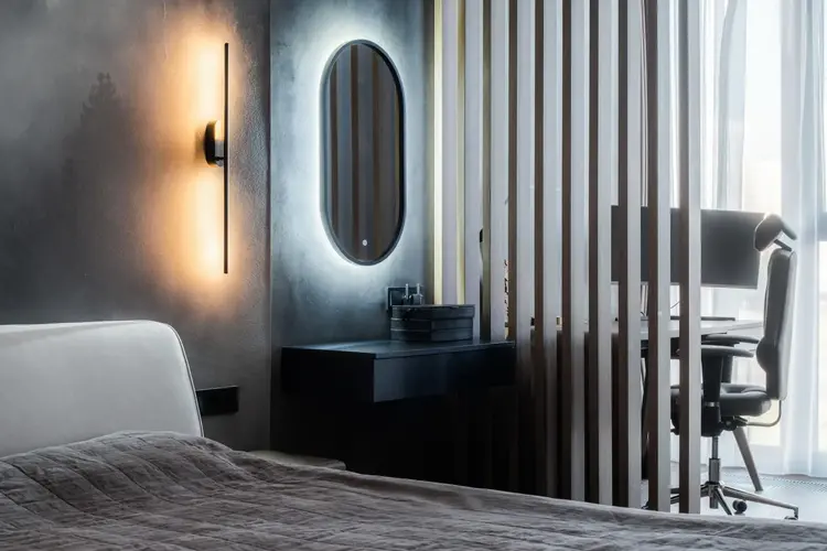 Смесители Groe, зеркало, умывальник с подвесной тумбой, полотенцесушитель Margaroli.