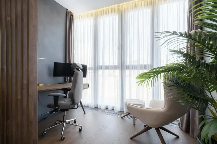 В спальне - кровать, 2 прикроватные тумбы, комод, стол письменный, кресло, пуф, офисный стул KULIK SYSTEM, зеркало. Матрац “ASKONA".Осветительные приборы, шторы, рольштора.
