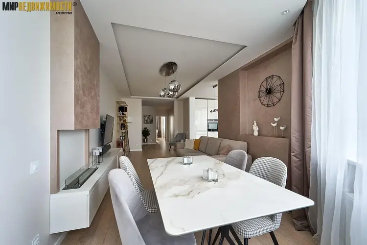 - Гостиная с большим диваном и столом из керамогранита в столовой зоне.