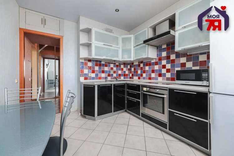 -Кухня организована функционально и удобно для повседневной жизни: напольная плитка устойчива к нагрузкам, рабочая зона защищена керамикой, встроенный гарнитур с качественной фурнитурой и встроенной техникой выглядит цельно и аккуратно. Пространство хорошо освещено, есть место и для готовки, и для спокойных семейных ужинов.