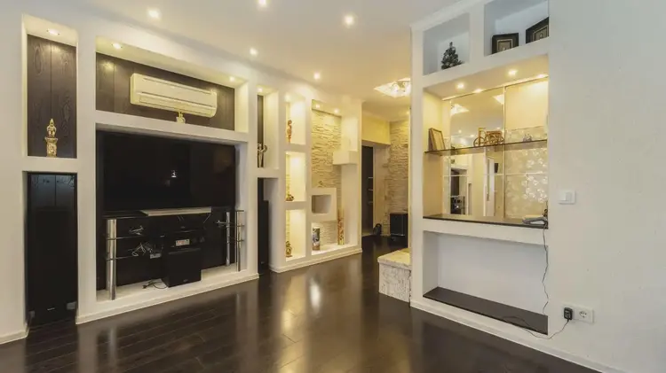 В гостиной предусмотрена зона отдыха, установлен домашний кинотеатр, кондиционер.