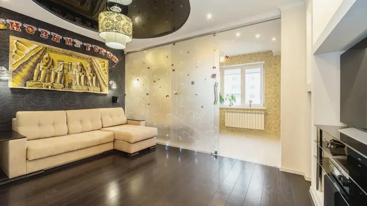 Жилая комната площадью 25.2кв.м разделена раздвижной стеклянной перегородкой для зонирования помещения на спальню 11.2кв.м. и гостиную 14кв.м.