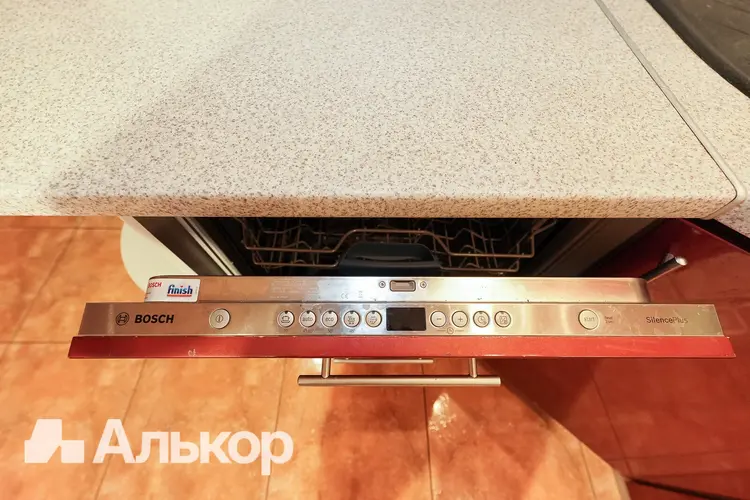 Кухня изготовлена на заказ имеет всю необходимую встроенную технику: духовой шкаф Bosch, свч, варочную панель Bosch, вытяжку, посудомоечную машину Bosch, холодильник LG, морозильник.