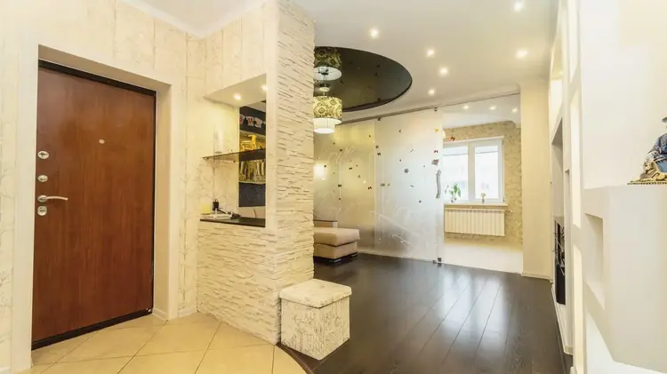 На стенах изысканные обои Германия, Италия и декоративная отделка. В прихожей на стенах искусственный камень. Дизайнерские светильники.