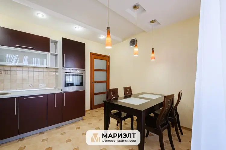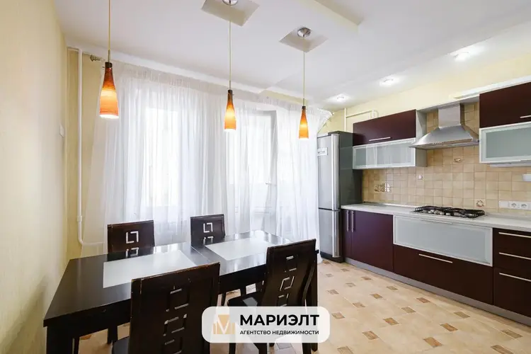 Кухня оборудована необходимой техникой: газовая плита, духовой шкаф, холодильник. Предусмотрено достаточное количество мест для хранения вещей, обеденный стол и стулья.