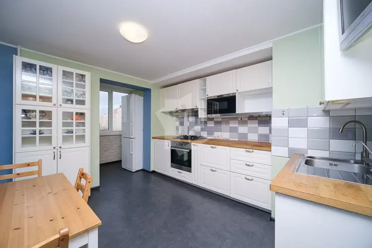 Квадратные раздельные комнаты, максимум полезного пространства. Окна выходят на две стороны. Большая (11.3м2) кухня с выходом на застекленную лоджию. В комнатах – стеклопакеты