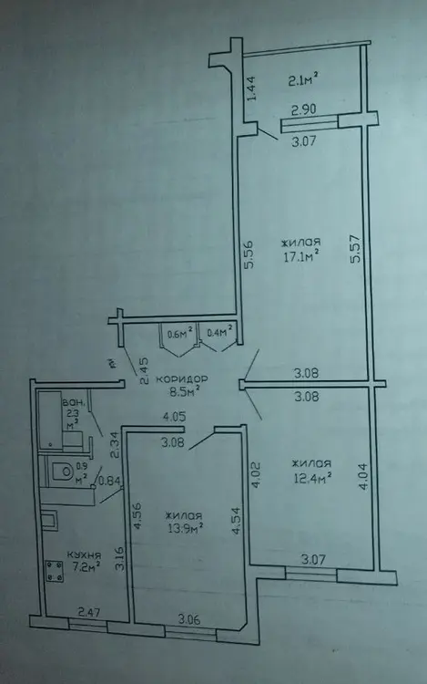 - Общая площадь квартиры составляет 63,3 кв.м. с 3-мя раздельными жилыми комнатами: 13.9 кв.м, 12,4 кв.м. и 17,1 кв.м.