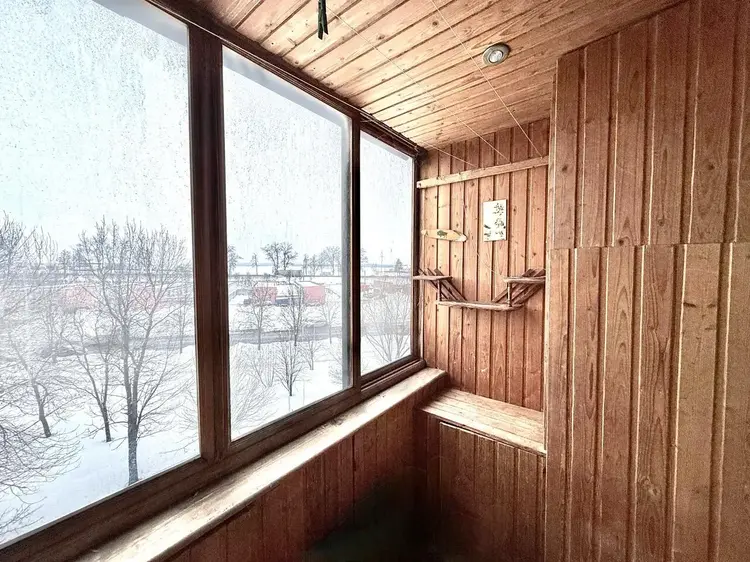 Лоджия застеклена и обшита вагонкой. Есть шкафы для хранения.