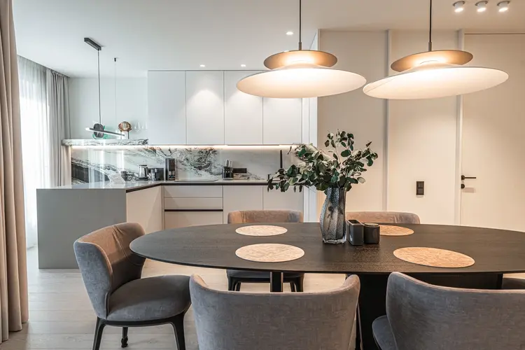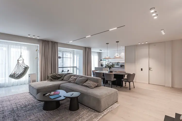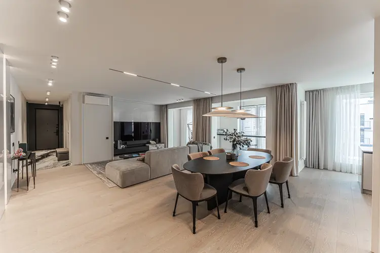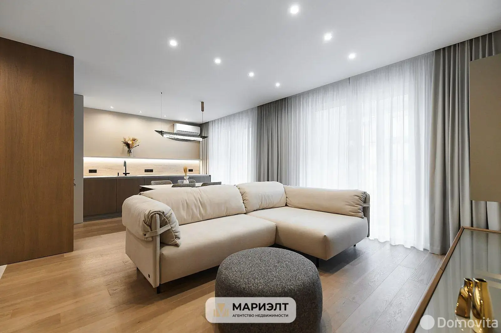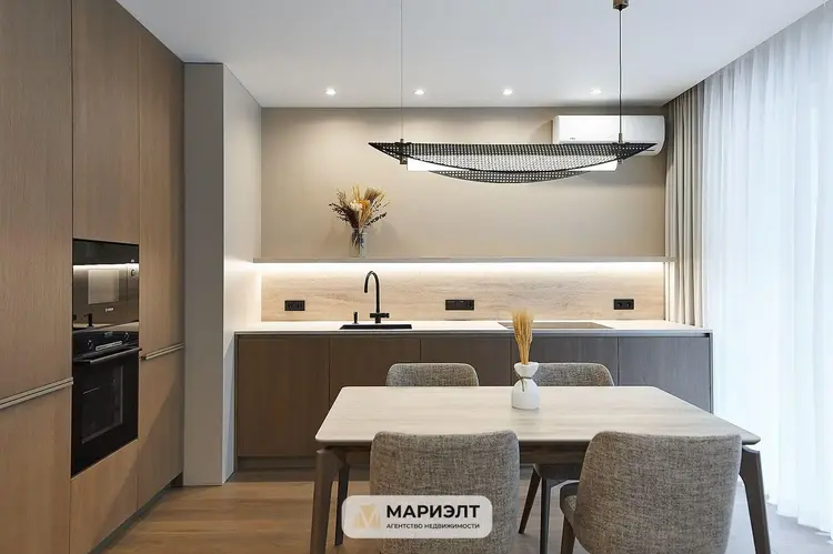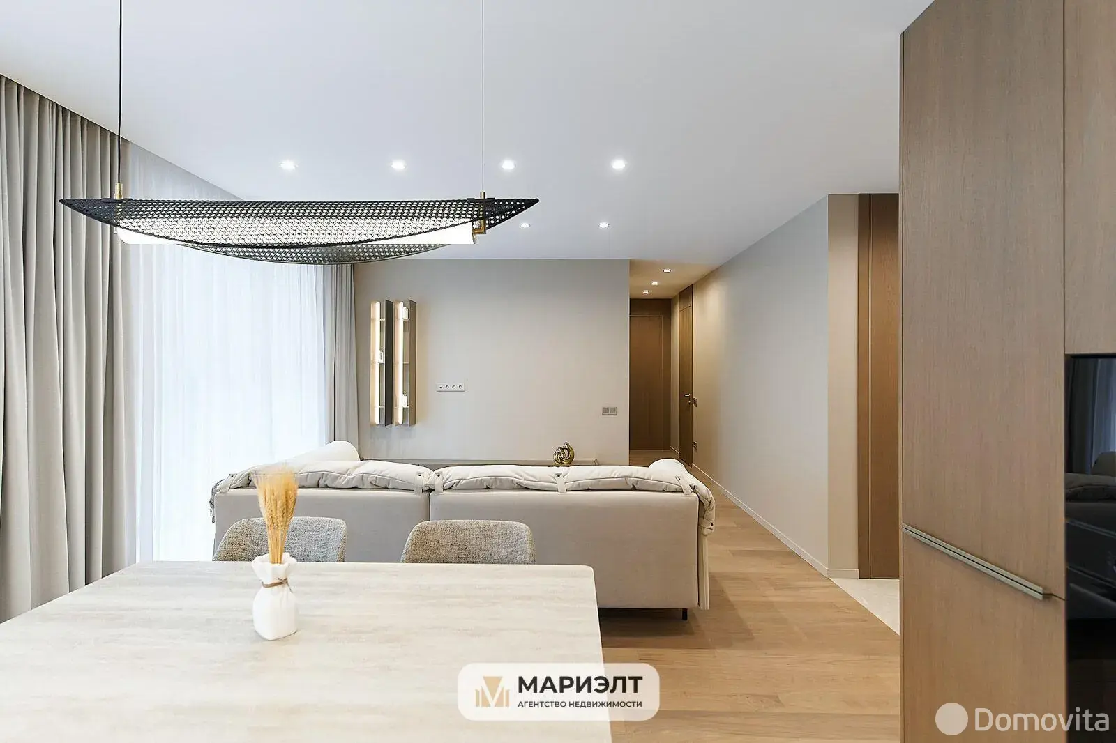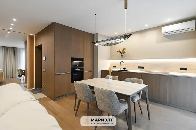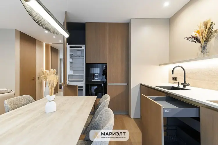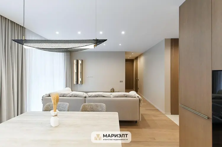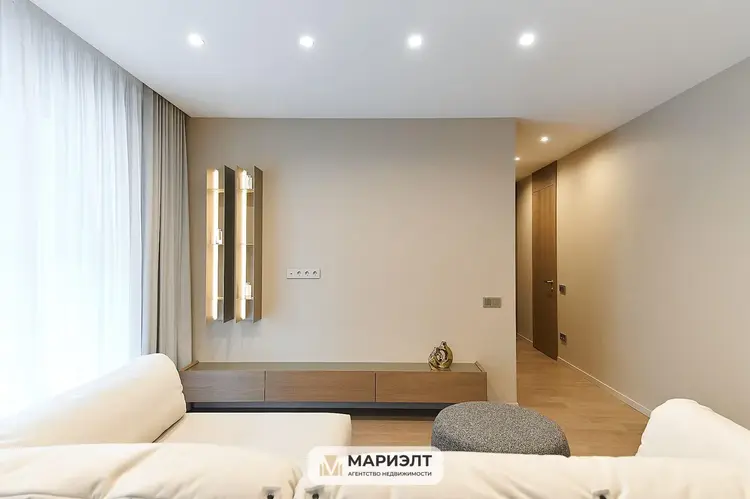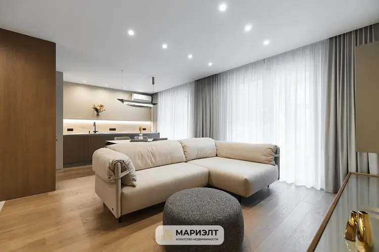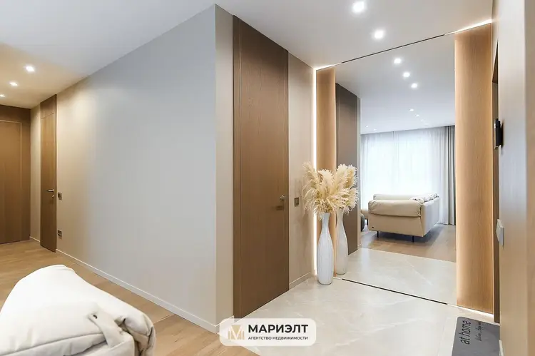 Проект квартиры изготовлен известными дизайнерами г.Минска. В квартире: мебель изготовлена по индивидуальному проекту компанией Domani из шпона дуба+ керамогранит Inalco (премиум Испания). Дери изготовлены компанией Lazio. Паркет на полу. В сан/узле + пол керамогранит, фуга эпоксидная, сантехника встроенная, инсталляция TECE (Германия), встроенный трап в плитку. В квартире предусмотрено несколько режимов освещения со скрытыми Led подсветками в мебели. Мастер-выключатель.