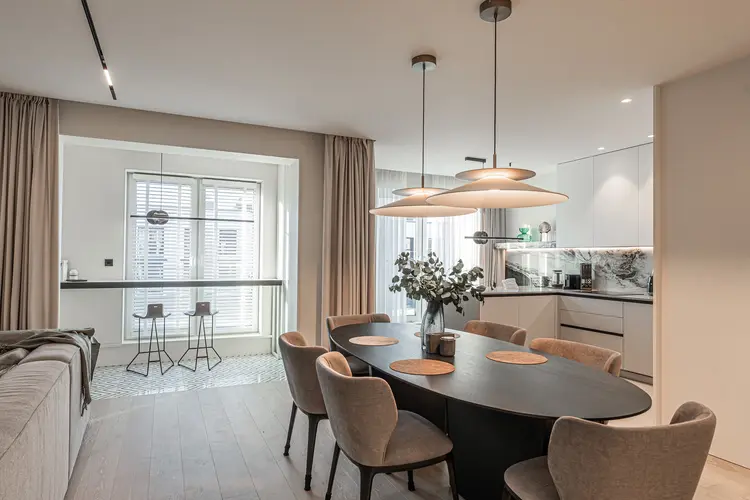 Диван и кровать изготовлены по индивидуальному проекту. Стулья из массива дуба покрытые тонированным маслом. Кухня нестандартной глубины с увеличенной рабочей поверхностью. Техника в кухне бренда BOSCH, посудомоечная машинка , холодильник с функцией No Frost, варочная поверхность индукция со встроенной вытяжкой, эл/теплый пол с датчиком регулировки температуры с возможностью управления Алиса.