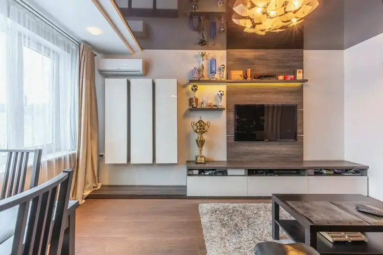 Выровнены стены, потолки, произведена замена всей электрики, установлены кондиционеры.