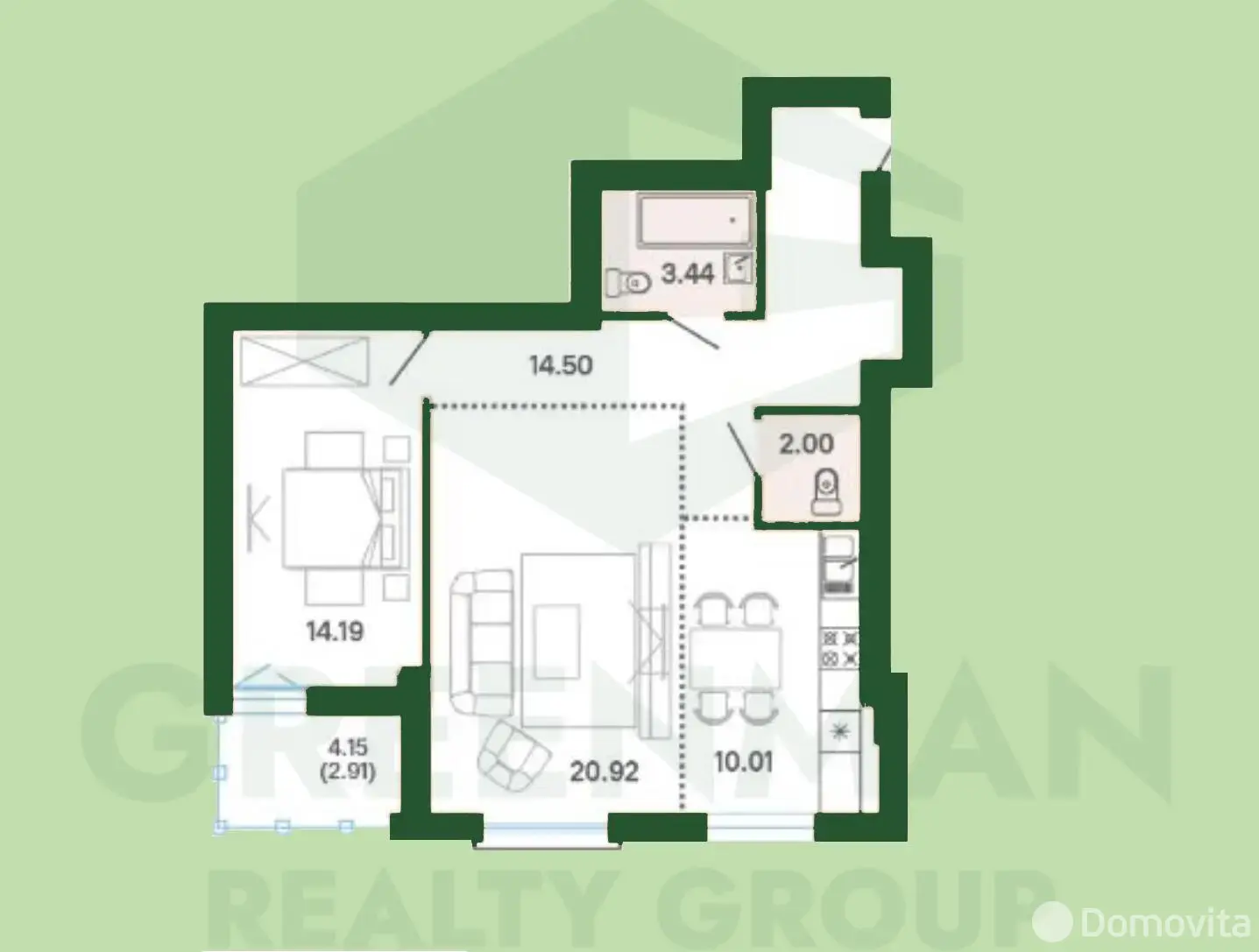 Общая площадь составляет 69 м2. Выделена уютная спальня. Площадь позволяет сделать как просторную двухкомнатную квартиру, так и евротрешку. Все зависит от потребностей вашей семьи.